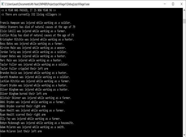A project to generate non-playable character (NPC) dialogue that gives the illusion of a deeper game world by simulating the population growth of a pre-industrial village and assigning dialogue based on important events or personality traits.