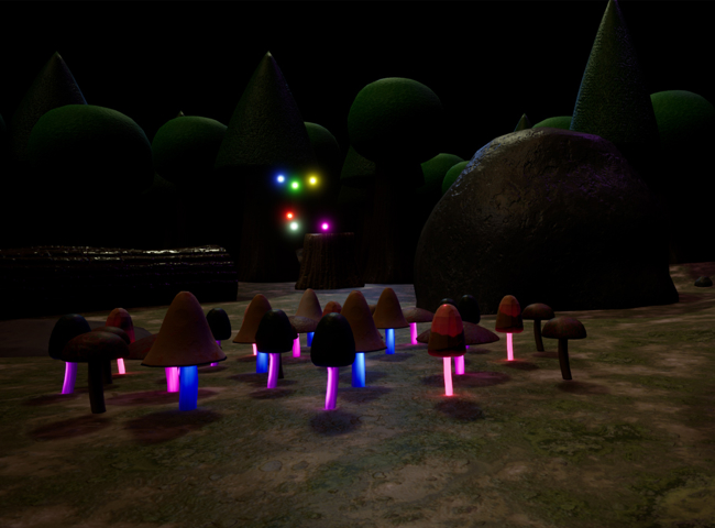 My project is about using different lighting patterns to provoke certain emotions from an audience. My main goal is finding out different lighting patterns that can provoke a certain emotion to be used in story games so they can do away with needless exposition. For this I have made a magical forest as this let me further my 3D environment-creation skills and allowed me to add extra sources of light such as mushrooms and fireflies with different colours. Most people recognise that a red light means danger or warning and I want to expand that to other colours too. The forest I’m creating is inspired by fantasy and magical realism which means the scene will look normal at a glance but the more you look the more unnatural and magical the scene will become.